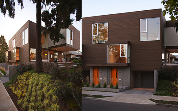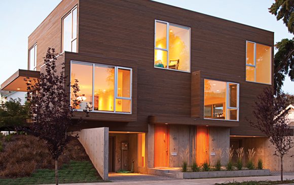 This 4,528 SF wood framed zero-lot-line project features two 3-story family dwellings on an original 50' x 100' lot. Key elements include mass soil exports, on-site sanitary manhole and storm water retention, reuse of soils shoring materials for framing to save costs, careful tree preservation planning, quality control with in-house finish carpentry for lower costs and higher levels of craftsmanship, and innovative precision-engineered staircases. Integration of commercial features without the commercial price include the large sliding door and window installs, the assimilation of aluminum drywall reveals, and production of architectural concrete elements. Award winning results. |